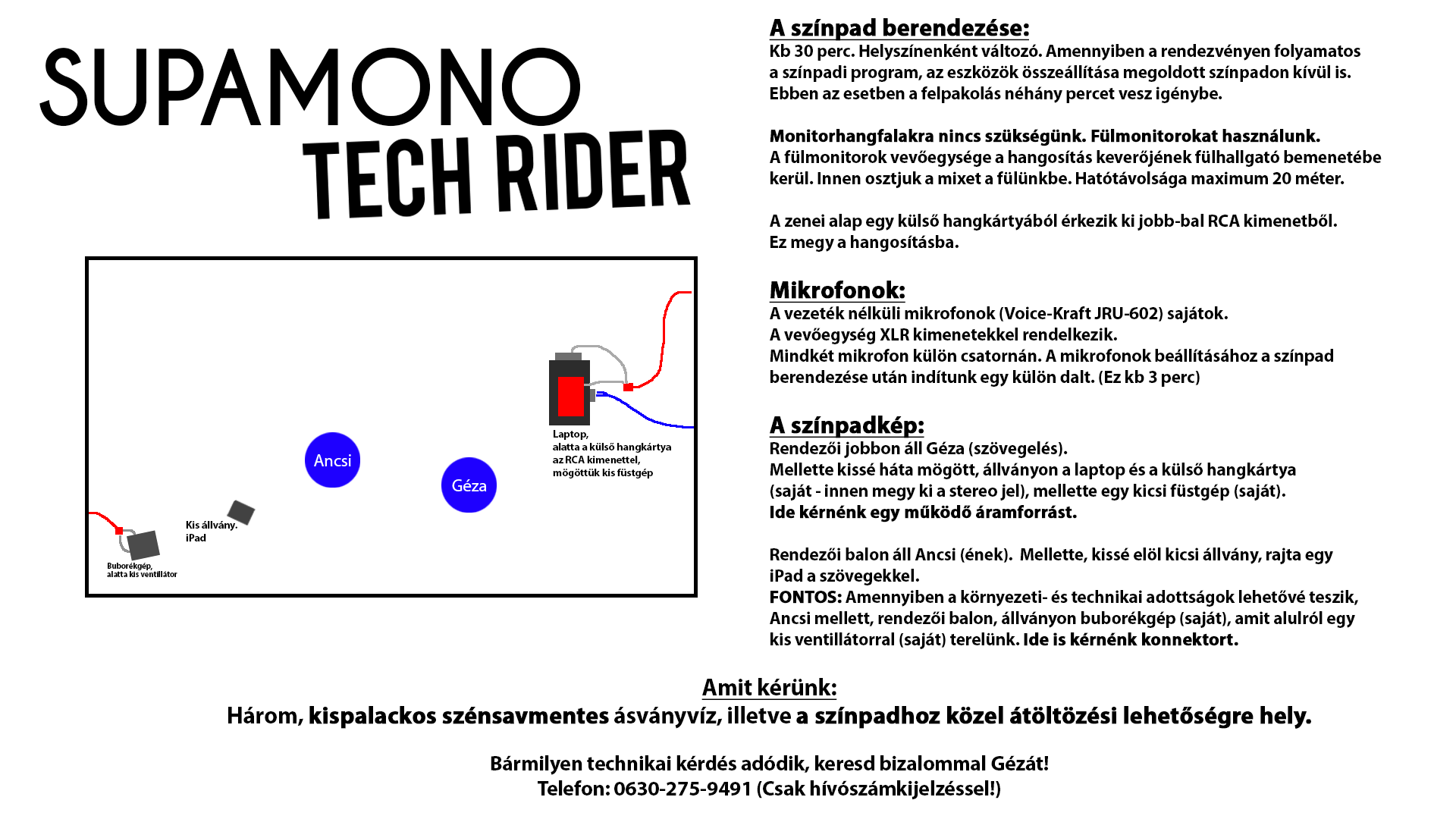 A SUPAMONO együttes "félplayback" produkció - saját, élő mikrofonokkal. A zenei alap, és az előre kikevert mikrofonok szoftverből, illetve egy saját keverőből érkeznek ki jobb-bal 6,3 jack csatornán keresztül. A popduó tehát bátran ajánlott "mobilisabb" rendezvényekre is.